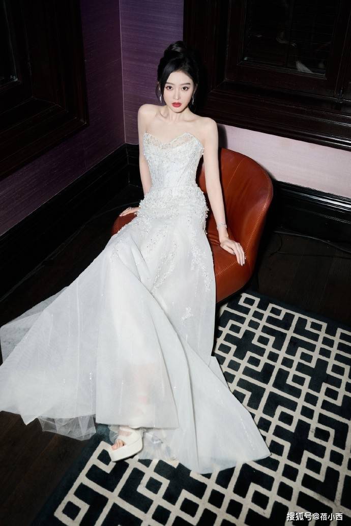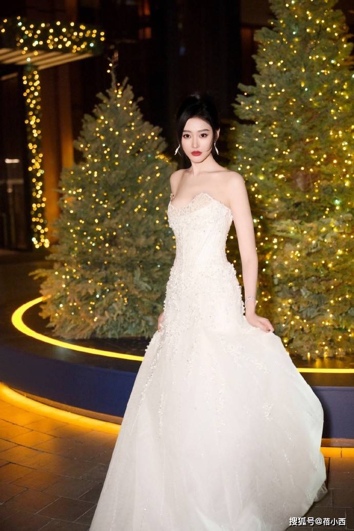 如果想要尝试温柔风搭配,可以看看她这一身连衣裙的造型,身穿自带柔光质感的白色薄纱抹胸连衣裙,在灯光下闪着细碎的星光,保留了白色礼服的纯洁感,又用精致的钉珠设计增添了贵气感,完全不会显得单调。