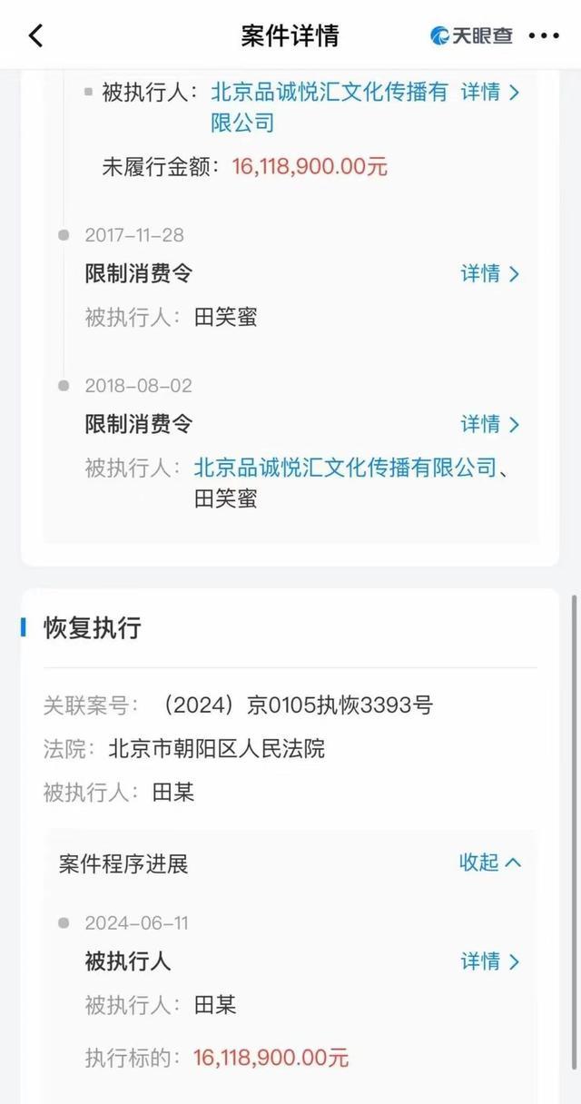 田笑蜜2016年就被列为失信被执行人的记录,被翻出来了。
