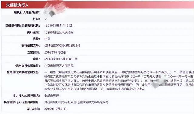 2016年7月,中国执行信息公开网上出现了一条记录:朱丹垫付款1600万元,被执行人田某某,履行情况——全部未履行。